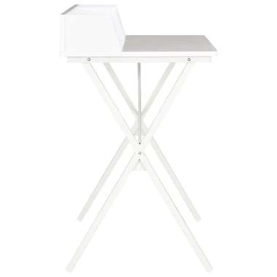 Dit compacte bureau heeft een ingetogen maar praktisch ontwerp en is een handige toevoeging aan je werk- of studeerkamer. De verhoogde achterkant en het grote blad, samen met de kleine vakken, bieden ruimte aan boeken en kleine spulletjes, zoals pennen. Zo kan je alles netjes geordend houden. Dit bureau kan ook gebruikt worden als schrijftafel of knutseltafel.