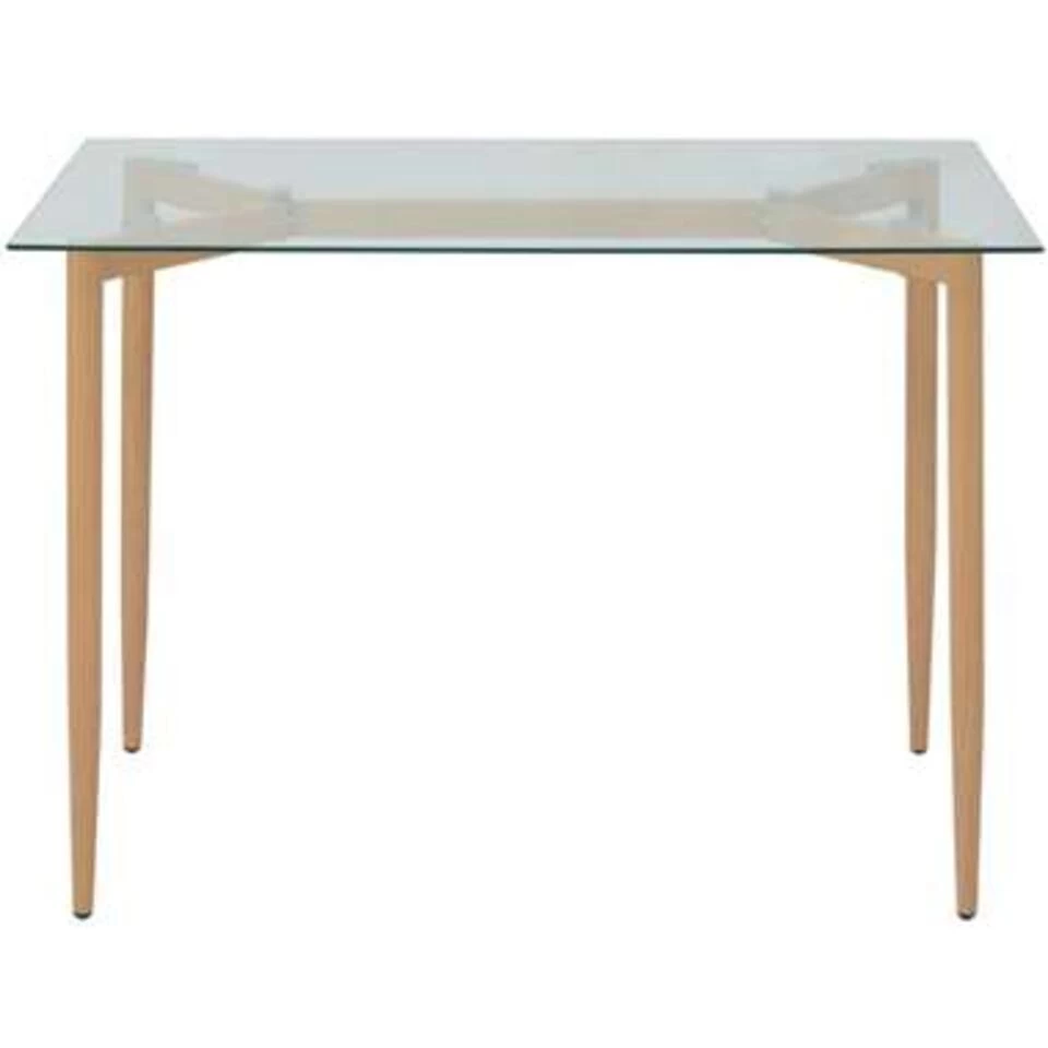 - Materiaal: glazen tafelblad + metalen poten met houten print