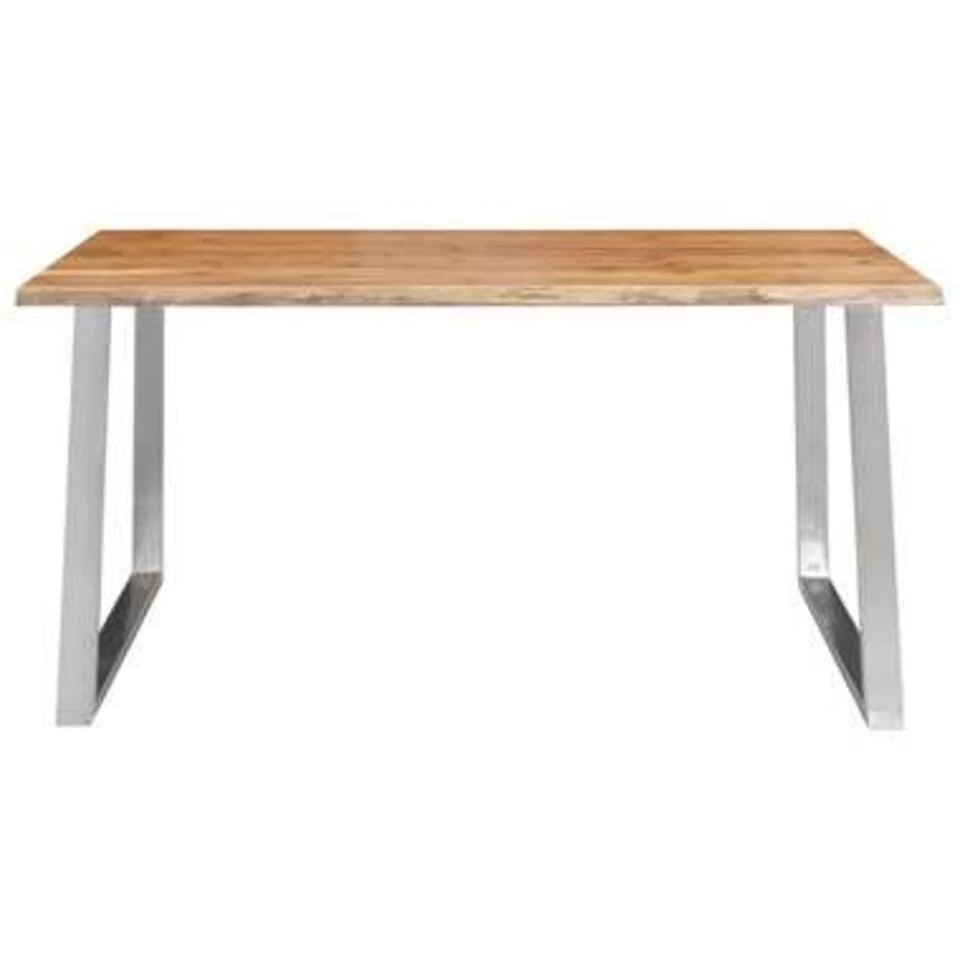 Het tafelblad is gemaakt van massief acaciahout en is buitengewoon stevig. De rand van het hout, dat de natuurlijke vorm van de boom volgt, maakt de tafel nog mooier. Bovendien dragen de roestvrijstalen poten bij aan de industriële charme en maken ze de tafel aanzienlijk stabiel. De tafel moet worden gemonteerd.