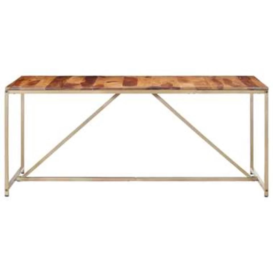 Deze houten eetkamertafel is gemaakt van massief sheeshamhout, dat ook wel bekend staat als rozenhout of palissander. Dit hout is een tropisch hardhout dat bekend staat om zijn natuurlijke nerven en gladde textuur. Het voortreffelijke vakmanschap draagt bij aan de spectaculaire retrostijl van de tafel. De messingkleurige gepoedercoat stalen poten maken het industriële uiterlijk compleet. Elke stap van het proces wordt met de grootste zorg uitgevoerd, of het nu polijsten, schilderen of lakken is. Onze tafel is eenvoudig te monteren.