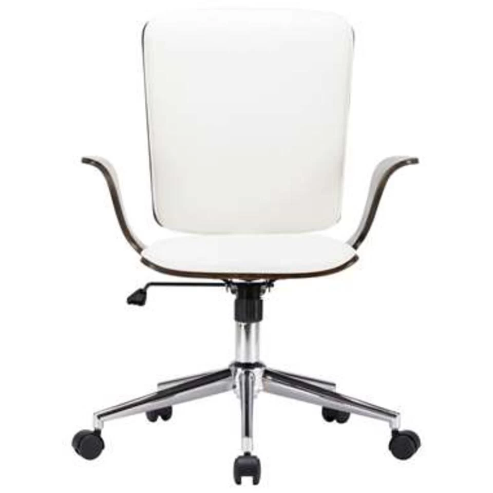 De zitting en rugleuning zijn ergonomisch ontworpen en bekleed met zacht, dik gevoerd kunstleer dat de stoel zeer comfortabel maakt. Het gebogen houten frame draagt bij aan zijn unieke schoonheid en stijl. Dankzij het gasveermechanisme is deze armstoel in hoogte verstelbaar. Hij is uitgerust met 5 wielen zodat je hem gemakkelijk kunt verplaatsen.