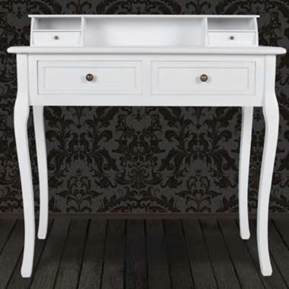 Deze prachtige kaptafel zal uw slaapkamer of kleedruimte volledig transformeren! Er zijn 2 verbindende laden aan elke zijde van het tafelblad om uw waardevolle spullen op te bergen. Daarnaast vindt u 2 grote laden op het onderste gedeelte van de tafel voor extra opslagruimte. De laden kunnen eenvoudig worden verwijderd om te worden gereinigd. De zachte, witte afwerking en de slank gevormde gebogen poten zorgen voor glans en klasse. De levering bevat 1 kaptafel. Er zijn bijpassende producten verkrijgbaar, zoals een krukje, passpiegel en meer. Houd er rekening mee dat dit meubel handgemaakt is, gemaakt is van hout en wit geschilderd is, waardoor het product een kleine afwijking kan hebben.
