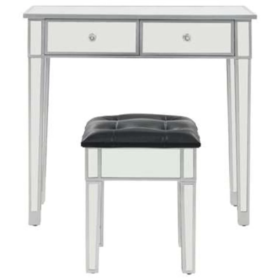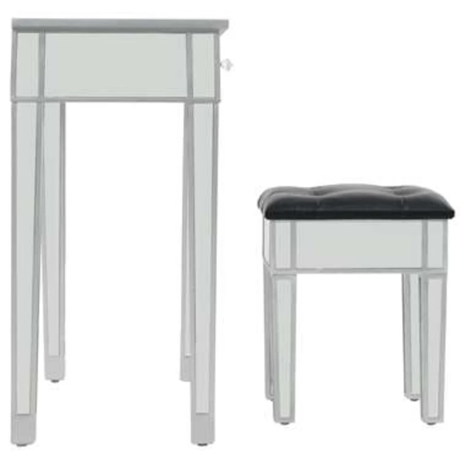 De gespiegelde kaptafel en kruk brengen een vleugje elegantie in je interieur. De tafelset is versierd met strak gespiegeld glas en straalt een verfijnde sfeer uit.