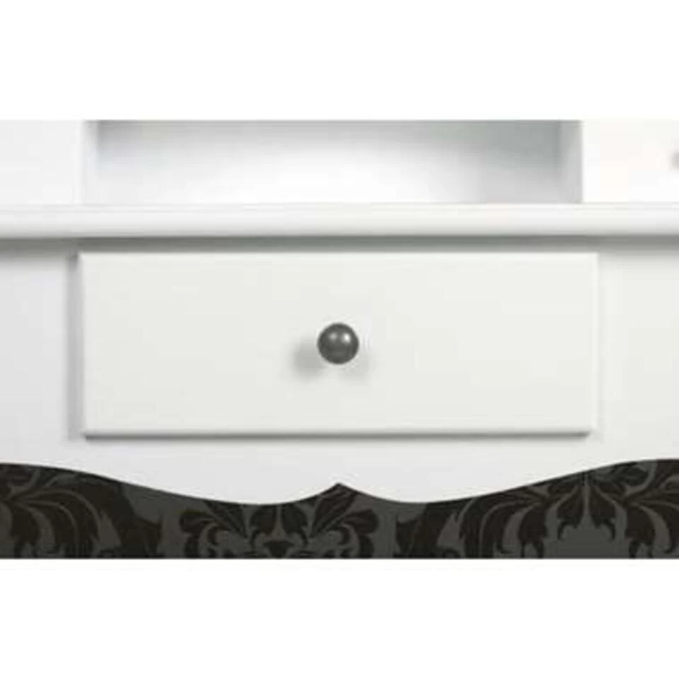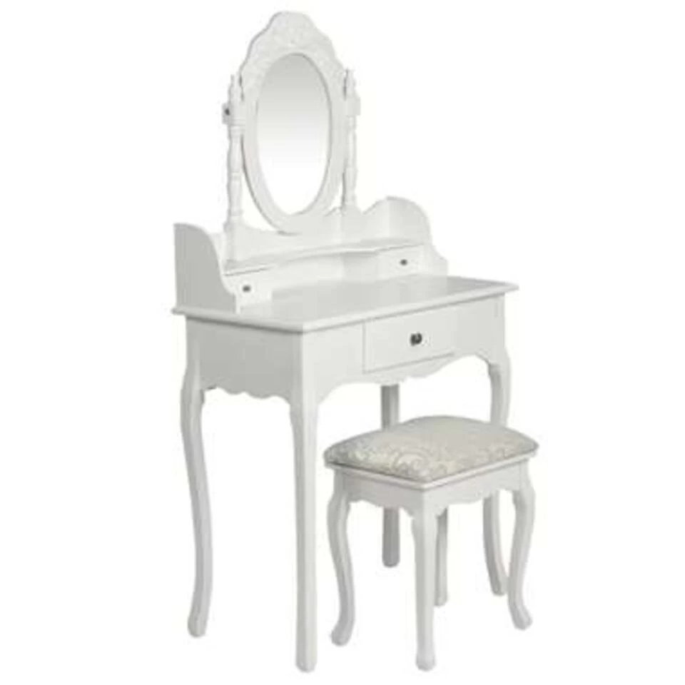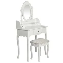 De tafel en het krukje worden gekenmerkt door rechte, strakke lijnen, gecombineerd met een romantisch patroon. Er zijn 3 lades voor het opbergen van make-up en andere spulletjes. De draaiende, ronde spiegel heeft een vrijstaand frame. Er is ook een stijlvolle knop die overeenkomt met het ontwerp van de kaptafel.