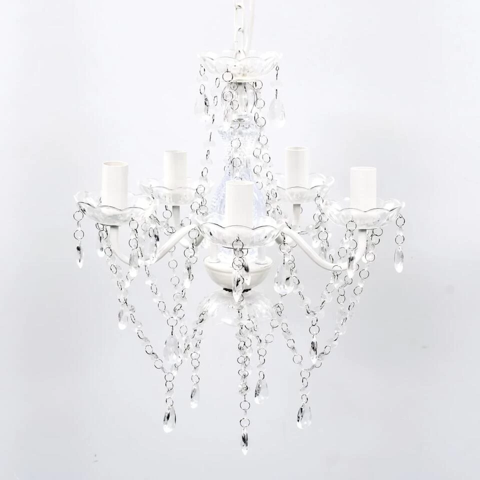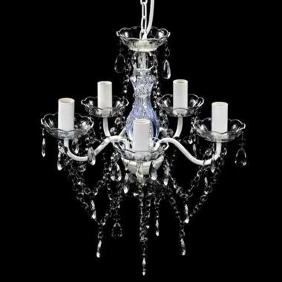 Deze hanglamp heeft een prachtig bewerkte centrale steel van kristalglas met gebogen acrylarmen, schansen en druppelkralen. Je kunt zowel gloeilampen als LED’s gebruiken.
